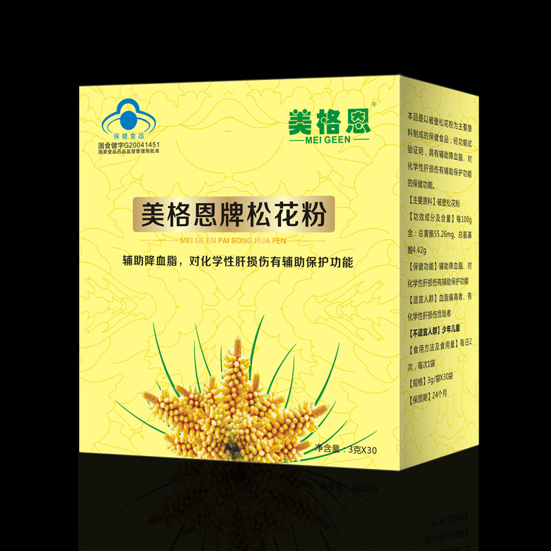 本品是以破壁松花粉為主要原料制成的保健品,經(jīng)功能試驗(yàn)證明,具有輔助降血脂、對(duì)化學(xué)性肝損傷有輔助保護(hù)功能的保健功能。